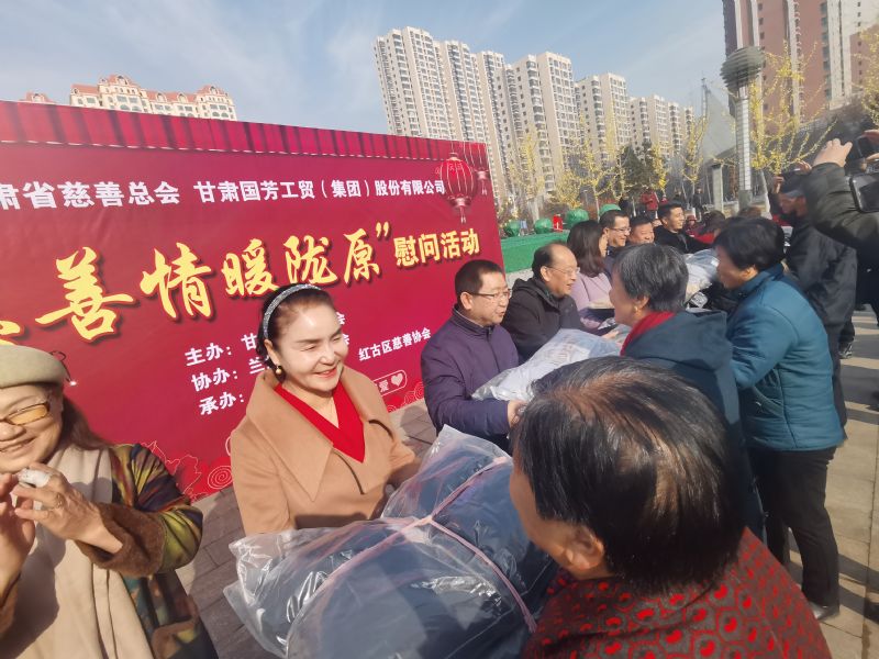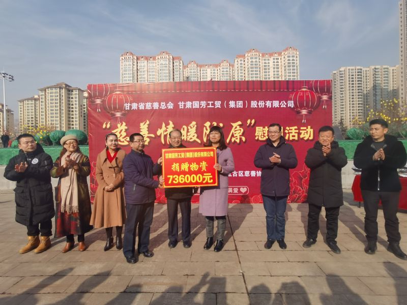 2020年1月14日,甘肅省慈善總會(huì)、蘭州市慈善會(huì)以及紅古區(qū)民政局?jǐn)y甘肅國(guó)芳工貿(mào)(集團(tuán))股份有限公司在蘭州市紅古區(qū)海石廣場(chǎng)共同舉行“慈善情暖隴原”暨物資捐贈(zèng)活動(dòng),將2000件棉衣,1200余件秋褲,2000余件保溫杯以及1000余件棉拖合計(jì)價(jià)值73.6萬(wàn)元的過(guò)冬物資帶給蘭州市紅古區(qū)的困難群眾。